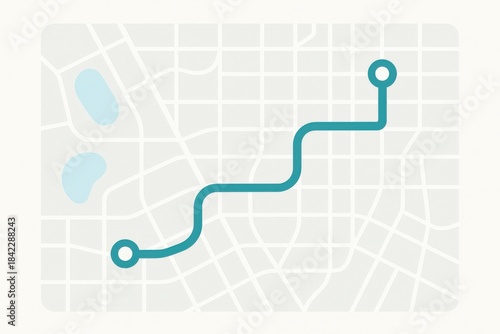 © Leo Rohmann, Obraz premium Abstract map illustration outlining an urban route with distinct paths and water features reflecting modern navigation concepts and city planning aesthetics