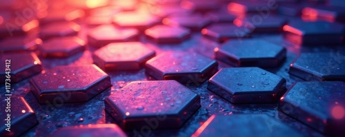 © sawaratch, Obraz premium Abstract metallic hexagonal grid, gleaming light reflections, surface, network