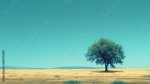 Fototapeta premium Abstract minimalist landscape with a single tree in a vast, open field under...