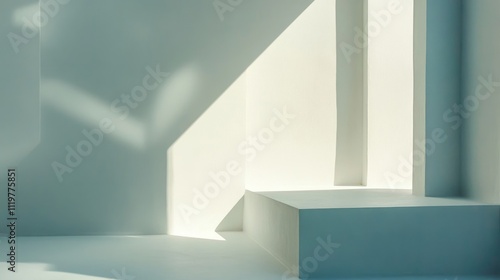 Fototapeta premium Abstract minimalistic interior with white geometric shapes and soft shadows creating a serene and modern atmosphere for design inspiration.