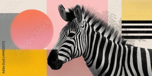 Fototapeta premium Abstract modern collage featuring a zebra head with geometric shapes and...