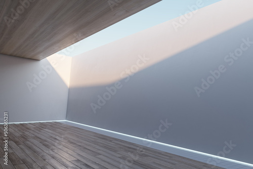 © Who is Danny, Fototapeta premium Abstract modern wooden and white concrete interior with ceiling opening with sky view. Mock up place on walls. 3D Rendering.