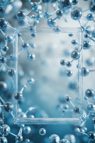 Obraz premium Abstract molecular structure with a transparent frame surrounded by blue atoms, representing science and technology themes.