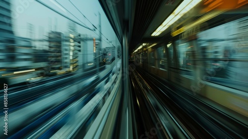 © suyu, Fototapeta premium Abstract Motion-Blurred View from the Front of a Train. Dynamic Urban Transportation Concept with Speed and Motion