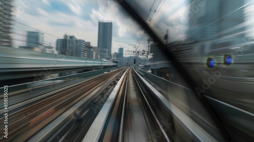 © suyu, Fototapeta premium Abstract Motion-Blurred View from the Front of a Train. Dynamic Urban Transportation Concept with Speed and Motion