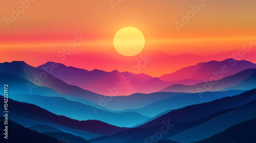© RENESA, Fototapeta premium Abstract mountain landscape with sun silhouette at a vivid sunset, vector design