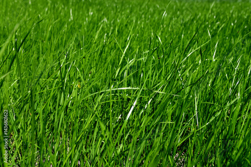 © Olga, Obraz premium Abstract natural plant background: green grass with a blurred background with the glare of the sun. Selective focus.