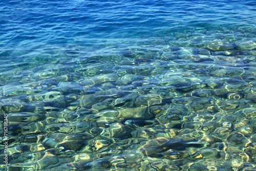 © Mariia, Fototapeta premium Abstract nature background. Backdrop. Wallpaper of little pebbles or stones in sea water. Pebbles under water. Nautical background. Clean sea water. Transparent sea. Beach summer background.