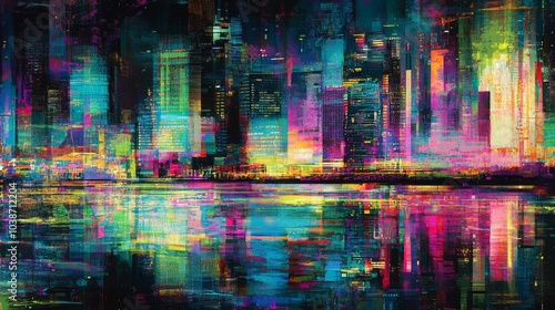 Naklejka premium Abstract Neon Cityscape Digital Painting with Glowing Lights and Water...