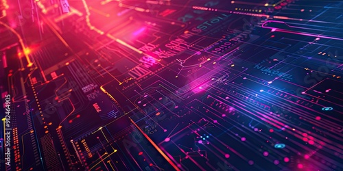 © jambulart, Obraz premium Abstract neon digital circuit board.