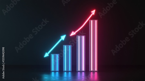 Fototapeta premium Abstract neon glowing bar graph with upward and downward trend arrows