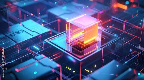 © Taufik, Obraz premium Abstract Neon Grid with Glowing Cube