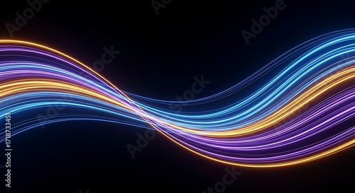 © nawis, Naklejka premium Abstract neon light waves in blue, orange, and purple colors.