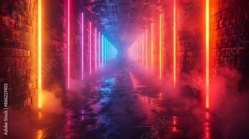 Naklejka premium Abstract neon lights casting colorful glows and reflections in a foggy, empty alleyway.