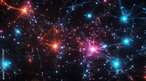 © ProStockGallery, Obraz premium Abstract Network Background with Glowing Nodes and Lines in Blue, Pink, and Orange Colors.