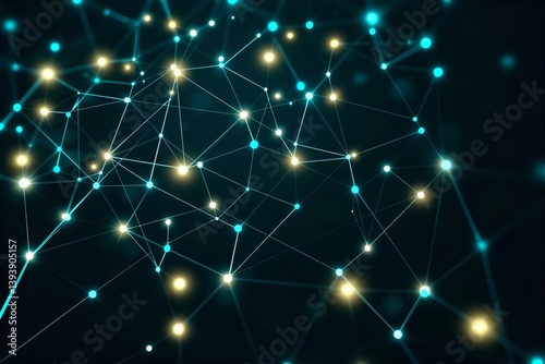 © Stock Photo Zone, Fototapeta premium Abstract Network Connection Background: Digital Data Nodes, Glowing Points & Lines, Technology Concept, Dark Blue & Yellow Illustration