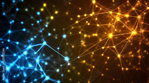 © Abdul, Fototapeta premium Abstract Network Connection Blue Gold Glowing Nodes Lines