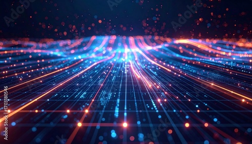 Obraz premium Abstract Network Data Flow with Blue and Orange Glowing Lines and Grid...