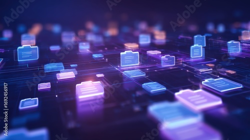 Obraz premium Abstract network grid with files and folders, futuristic software interface, digital document management system, store, search and organize documents, corporate business, paperless office