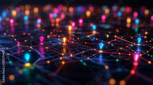 © Ashalina, Obraz premium Abstract network map with glowing nodes and connections.