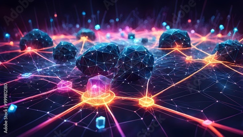 © Sutarto Stock, Obraz premium Abstract network with glowing nodes and lines.