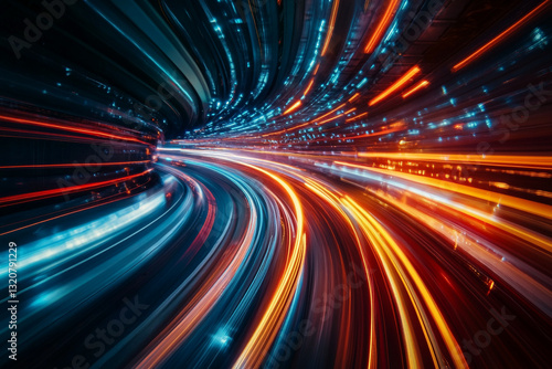 © Shahazadi, Obraz premium Abstract night cityscape light trails dynamic speed blurred motion blue fast urban lines vivid energy