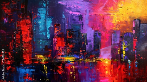 © Thanthara, Obraz premium Abstract oil painting, futuristic buildings, vibrant palette, night, high angle, neon glow.