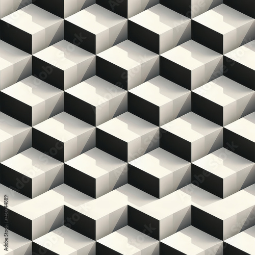 © PuriStudio, Obraz premium Abstract optical illusion tile pattern with floating cubes in black and white. This design creates mesmerizing visual effect