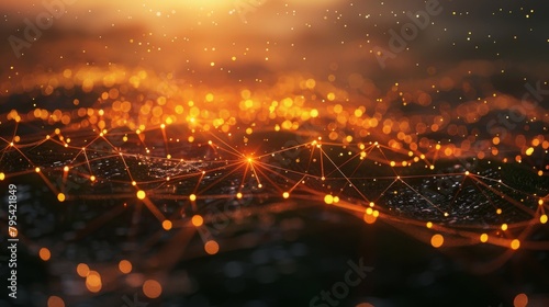 © Pornarun, Fototapeta premium Abstract orange glowing plexus background