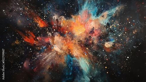Naklejka premium Abstract Painting Depicting a Cosmic Nebula with Bright Colors and Glittering...