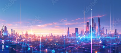 Fototapeta premium Abstract painting of a smart city featuring intricate wave lines and...