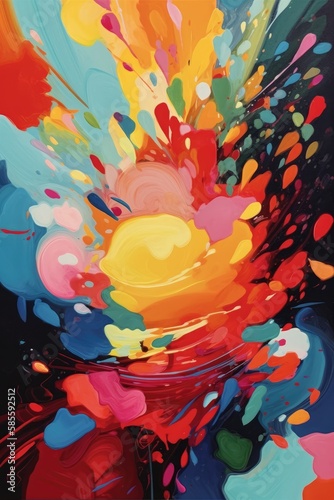 © dreamalittledream, Fototapeta premium Abstract painting splashes of paint in synchronised colorful grouping, on canvas. Generative ai. Very colourful and vibrant realistic paint splashes