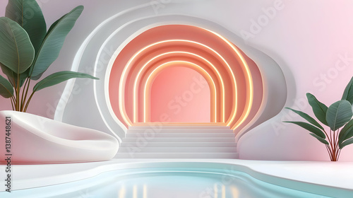 Naklejka premium Abstract Pastel Pink and White Interior with Neon Arch and Pool