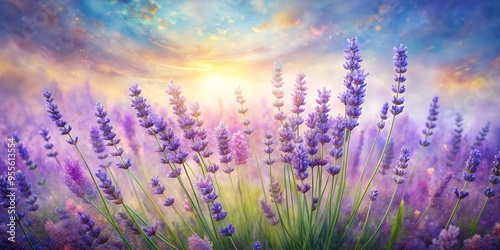 © Man888, Naklejka premium Abstract Pastel Watercolor Painting Of A Field Of Blooming Lavender Flowers Swaying Gently In The Breeze