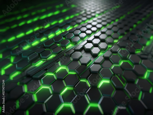 Obraz premium Abstract pattern of black hexagonal shapes with glowing green lines and a...