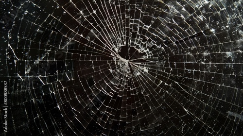 Fototapeta premium Abstract pattern of spider-web cracks emanating from a central hole in a pane of glass, showcased against a deep black backdrop