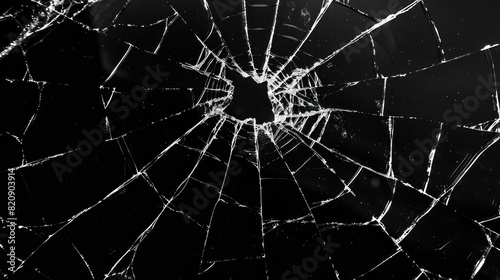© Santy Hong, Fototapeta premium Abstract pattern of spider-web cracks emanating from a central hole in a pane of glass, showcased against a deep black backdrop.