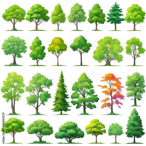 © IFTIAR, Fototapeta premium Abstract pattern trees collection. Set Forest tree pack in white background, a collection of hand drawn watercolor trees for artistic projects.