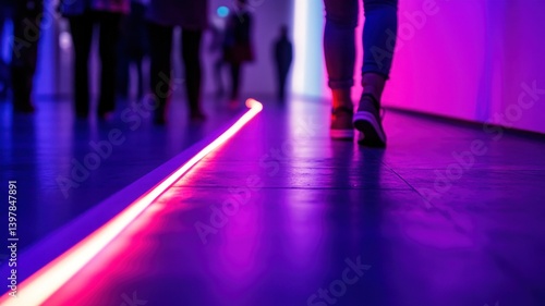 © Nur, Fototapeta premium Abstract photo of people walking in a hallway with neon lights and vivid colors