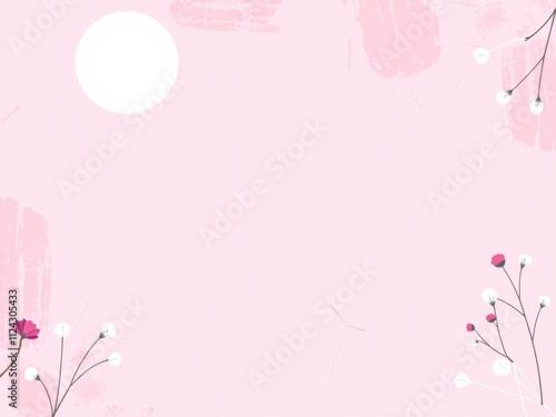 © Pimchada, Naklejka premium Abstract pink and lilac background with swabs, flowers, leaves, thin black lines, and a big white circle, abstract, pink, lilac