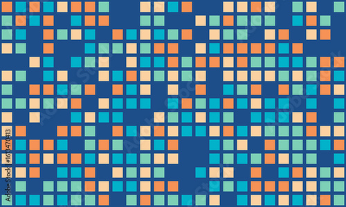 © Olena, Fototapeta premium Abstract pixelated pattern in teal, orange, and beige on a navy blue background. Perfect for website banners, tech presentations, or modern design projects.