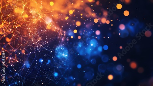 © ChiffonCake, Fototapeta premium Abstract polygonal background with low-poly design and glowing dots in dark blue, orange, colors. Big data concept in a futuristic