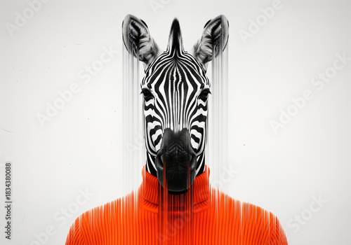 © Lereen, Obraz premium Abstract portrait of an anthropomorphic zebra in an orange turtleneck with a melting digital glitch effect