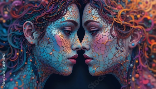 Naklejka premium Abstract portrait of two women with faces like stained glass, connected by vibrant, swirling hair.