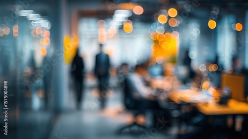 © Harry, Fototapeta premium Abstract portrayal of a modern office environment with blurred figures and warm, inviting light fixtures ambiance.