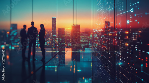 © Teeraphon, Obraz premium abstract professional business team people connection of line from nail node to node on Smart digital cityscap and skyline background , Innovation networking concept