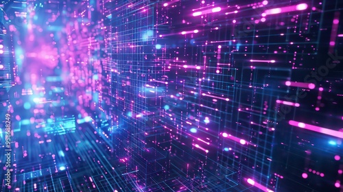 Fototapeta premium Abstract purple and blue digital network with glowing lights.