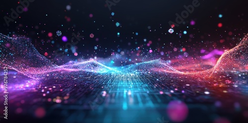 Obraz premium Abstract quantum computing with floating particles and grids