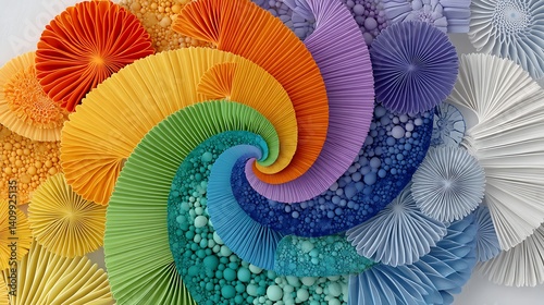 Naklejka premium Abstract Rainbow Spiral Artwork Colorful Paper Pleats and 3D Sphere Design