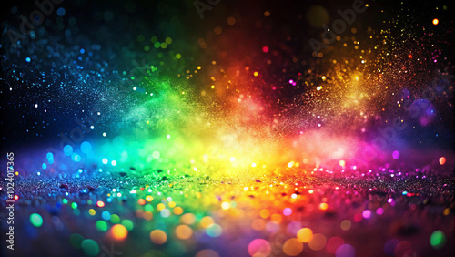 © Albaloshi, Obraz premium Abstract rainbow texture spectrum of glitter creating a mesmerizing sparkle effect dazzling array of colored sparkles cascading over a dark background.